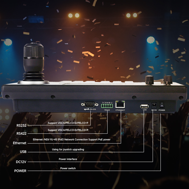 The joystick controller supports multiple control protocols: VISCA over IP, NDI Control,Pelco-P,Pelco-D, Sony VISCA Compatible, ONVIF.
